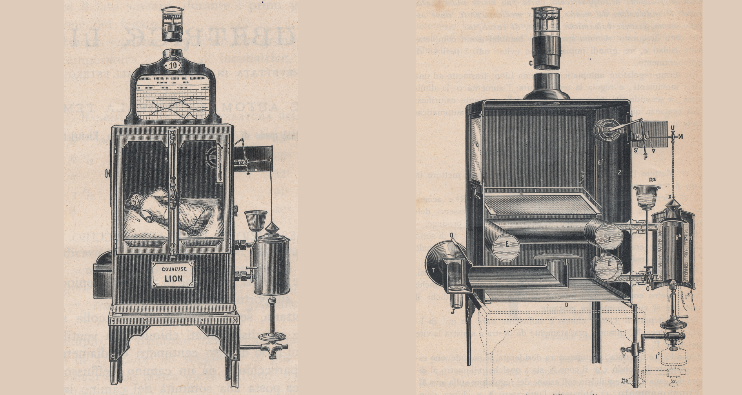 In 1889, engineer Alexandre Lion (1861-1934) developed a large incubator for 5,000 chicken eggs, which he exhibited in Marseille as a tourist attraction. For a modest admission fee, families seeking entertainment could admire freshly hatched chicks. The following year he designed an incubator for human babies and exhibited that too. Poor people were allowed to bring their prematurely born child there, who would then be fed and cared for by a wet nurse–for free. All costs were covered by the admission fees. Lion’s incubator was technically very ingenious and could maintain a constant temperature, thanks to an innovative thermostat and a system of tubes through which warm water flowed. This made Lion’s invention superior to the hot water bottle devices that had been commonly used in hospitals until then.
